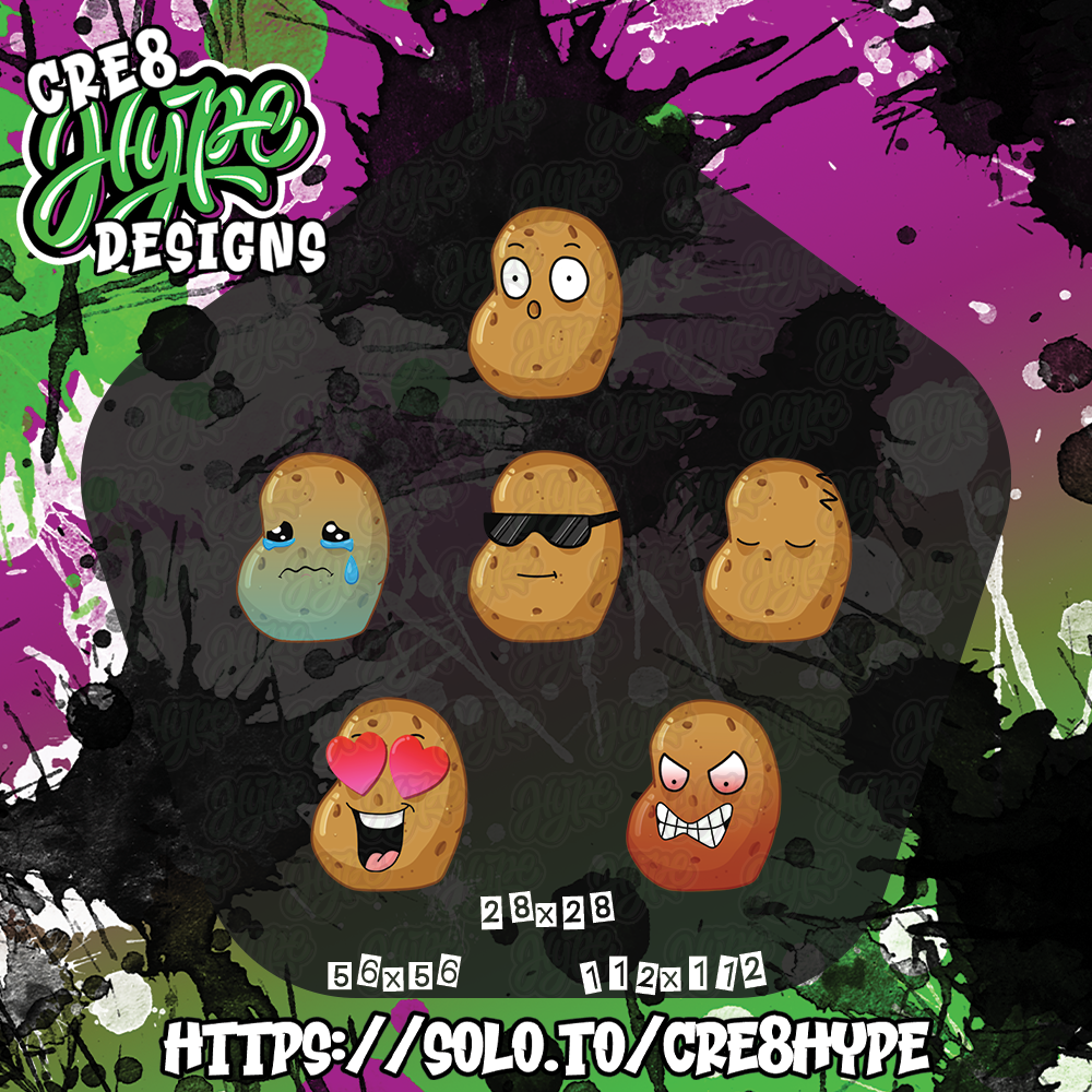 Dive into the world of tuber-inspired expression with our sensational bundle of 6 meticulously crafted potato emotes, ready to take your Twitch and Discord interactions to the next level!